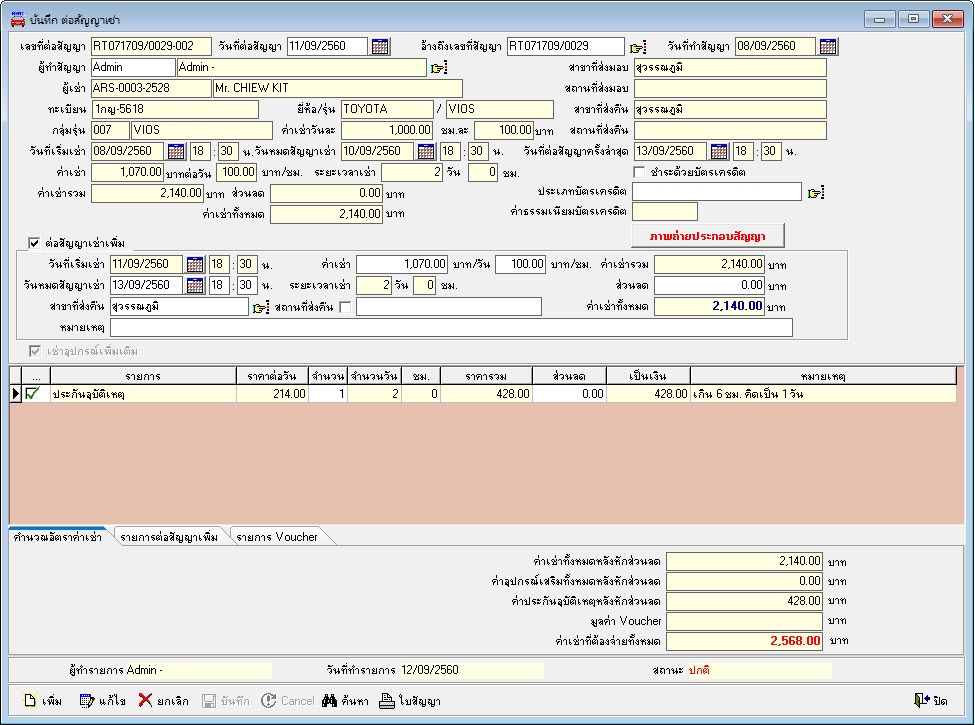 4.3 บันทึกสัญญาเช่า สามารถดึงจากเมนูยืนยันราคาได้ หรือคีย์ข้อมูลรายละเอียดสัญญา ซึ่งหน้านี้จะประกอบด้วย ข้อมูลผู้เช่า รายละเอียดรถที่ต้องเช่า รายการเพิ่มเติม ราคาค่าเช่า (รับชำระเป็นบัตรเครดิตเท่านั้น) รวมทั้งระยะเวลาเช่า เมื่อบันทึกรายการที่เมนูนี้เสร็จ เอกสารจะไปแสดงที่หน้าเมนูตรวจสอบรายกรสัญญาเช่า เพื่อให้พนักงานจัดเตรียมงานในขั้นตอนต่อไป