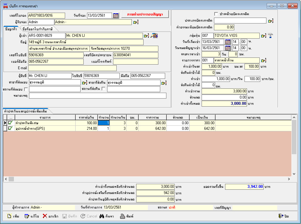 4.2 เมนูบันทึกการจองรถเช่า สำหรับบันทึกรับการจองรถเช่าจากลูกค้า ระบุชื่อลูกค้า ระบุวันที่เริ่มเช่าถึงวันที่สิ้นสุดระบบมจะคำนวณค่าเช่าทั้งหมดมาให้ตามอัตราค่าเช่าที่กำหนดไว้ รองรับการจองแบบมีวางมัดจำ หรือไม่วางมัดจำได้