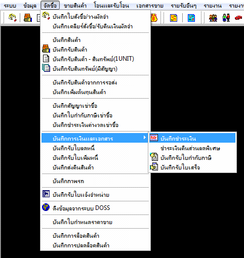 เมนูบันทึกชำระเงิน เป็นการทำงานเกี่ยวกับการชำระเงินค่าสินค้า ที่ทำการสั่งซื้อจากผู้จำหน่าย โดยมี รายละเอียดดังนี้ ขั้นตอนการเปิดหน้าบันทึกชำระเงิน เมื่อเข้าโปรแกรม เลือกเมนูจัดซื้อ-เ บันทึกการเงินและเอกสาร-เ บันทึกชำระเงิน ดังรูป