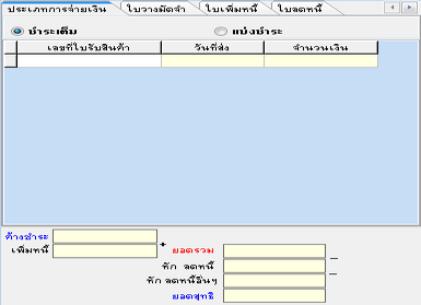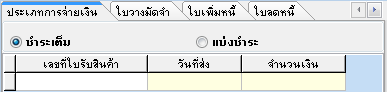 ส่วนที่ 2 รายละเอียดการชำระ รูปที่ img12_4 ส่วนสำหรับประเภทการจ่ายเงิน ต้องทำการเลือกใบรับสินค้า ใบวางมัดจำ ใบเพิ่มหนี้ และใบลดหนี้ มาทำ การชำระเงิน เป็นส่วนหลักของหน้านี้ โดยมีรายละเอียดดังนี้