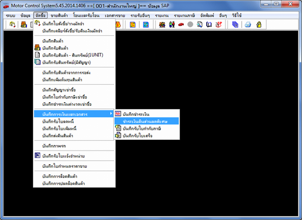 เป็นเมนูสำหรับการชำระคืนเงินที่เคยได้ส่วนลดพิเศษ จากผู้จำหน่าย ซึ่งอาจเกิดจากการผิดเงื่อนไขตามค่าส่งเสริมการขายที่ผู้จำหน่ายได้กำหนดไว้ มีรายละเอียดดังนี้ ขั้นตอนการเปิดหน้าบันทึกชำระเงินส่วนลดพิเศษ เลือกเมนูจัดซื้อ บันทึกการเงินและเอกสาร ชำระเงินคืนส่วนลดพิเศษ ดังรูป