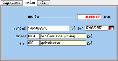 แสดงส่วนของการชำระเงินเป็นเงินโอน โดยระบุเลขที่บัญชี วันที่ ธนาคาร สาขา มีรายละเอียดดังนี้