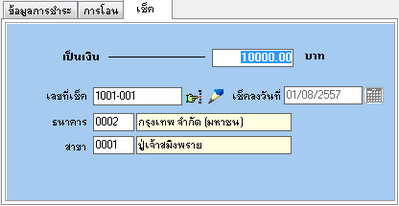 ส่วนของการแสดงการชำระเงินแบบเช็ค โดยใส่จำนวนเงิน เลขที่เช็คเช็คลงวันที่ธนาคารสาขา โดยมีรายละเอียดดังนี้