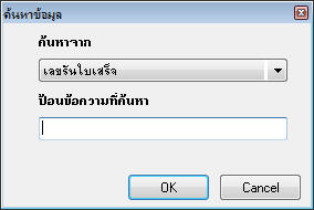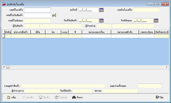 - โปรแกรมจะแสดงหน้าต่างค้นหาข้อมูล ซึ่งสามารถค้นหาใบสินค้าจากข้อมูลต่างๆดังนี้ เลขที่ใบกำกับภาษี, เลขรันเอกสาร, เลขที่ใบรับสินค้า, เลขที่ใบส่งของ, วันที่ส่งของ, รหัสผู้จำหน่าย, ชื่อผู้จำหน่าย - หลังจากเรียกข้อมูลขึ้นมาแล้ว ให้ผู้ใช้ตรวจสอบความถูกต้องของข้อมูล - กดปุ่ม - ถ้าหากไม่ต้องการบันทึกข้อมูลให้กดปุ่ม