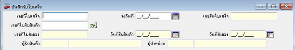 - เลขที่ใบเสร็จ ให้ผู้ใช้ทำการป้อนเลขที่ใบเสร็จที่ได้รับจากผู้จำหน่าย - เลขที่ใบรับสินค้า ทำการกดปุ่ม - ลงวันที่ ให้ผู้ใช้เลือกวันที่ที่แสดงในเอกสารที่ได้รับจากผู้จำหน่าย - เลขรันใบเสร็จ โปรแกรมจะแสดงเลขรันให้อัตโนมัติ - เลขที่ใบส่งของ, วันที่รับสินค้า, วันที่ส่งของ, ผู้รับสินค้า, และผู้จำหน่าย แสดงข้อมูลตามที่ได้บันทึกไว้ในหน้าบันทึกรับสินค้า, บันทึกรับสินค้า – สินทรัพย์(1Unit), หรือ บันทึกรับสินทรัพย์(มีสัญญา)
