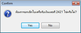 - โปรแกรมจะแสดงหน้าต่างค้นหาข้อมูล ซึ่งสามารถค้นหาใบสินค้าจากข้อมูลต่างๆดังนี้ เลขรันใบเสร็จ, เลขที่ใบเสร็จ, วันที่ในเลขใบเสร็จ, เลขที่ใบส่งสินค้า, วันที่ส่งของ, รหัสผู้จำหน่าย, ชื่อผู้จำหน่าย, เลขที่ใบกำกับภาษี, วันที่ในใบกำกับภาษี, เลขที่ใบรับสินค้า, และวันที่รับสินค้า - เมื่อทำการค้นหาเอกสารขึ้นมาเรียบร้อยแล้ว ให้ผู้ใช้กดปุ่ม - ระบบจะขึ้นกล่องข้อความขึ้นมาเพื่อให้ผู้ใช้ยืนยันว่าจะดำเนินยกเลิกเอกสารดังกล่าว
